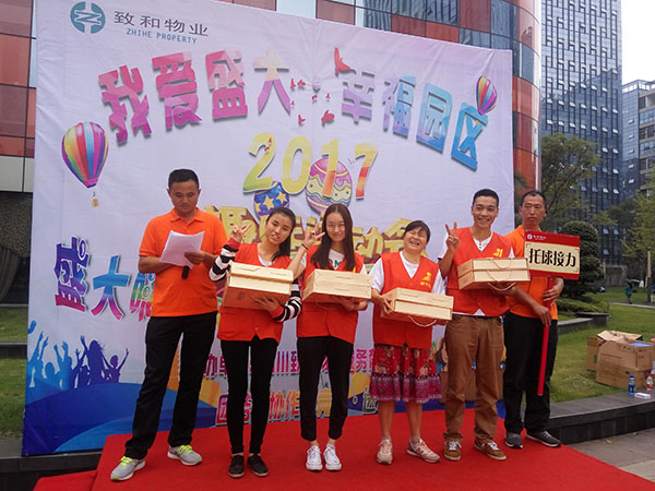 2017年9月26日,,,由致和物业组织的盛大国际园区业主运动会,,,银河yh0076在众多业主单位中体现突出,,,一连斩获托球接力、袋鼠接力、踏板行进折返跑等多个整体项目的第一名,,,获得了丰富的奖品。。