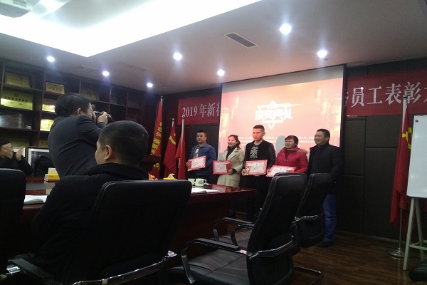 2019年1月31日,,2018年度优异员工表扬大会在集团公司聚会室召开,,经由对员工综合测评,,由部分认真人选举推荐,,治理班子研究,,报董事会批准:陈莉娟、罗黄琴、孔钰欣、刘强、刘宇、李芸、叶小双等共十一位同志被评为“2018年度优异员工”;;牛栋梁、杨启鹏、刘克俊三位同志被评为“2018年度优异治理者”,,集团公司董事长、总裁、常务副总裁对先进员工举行了颁奖。。。。